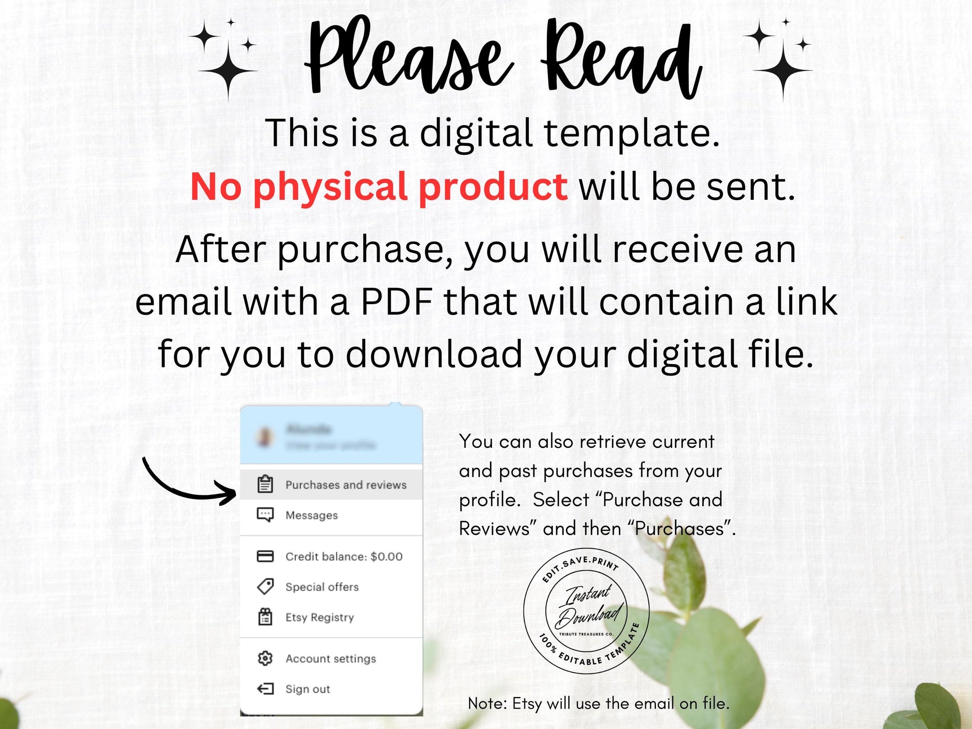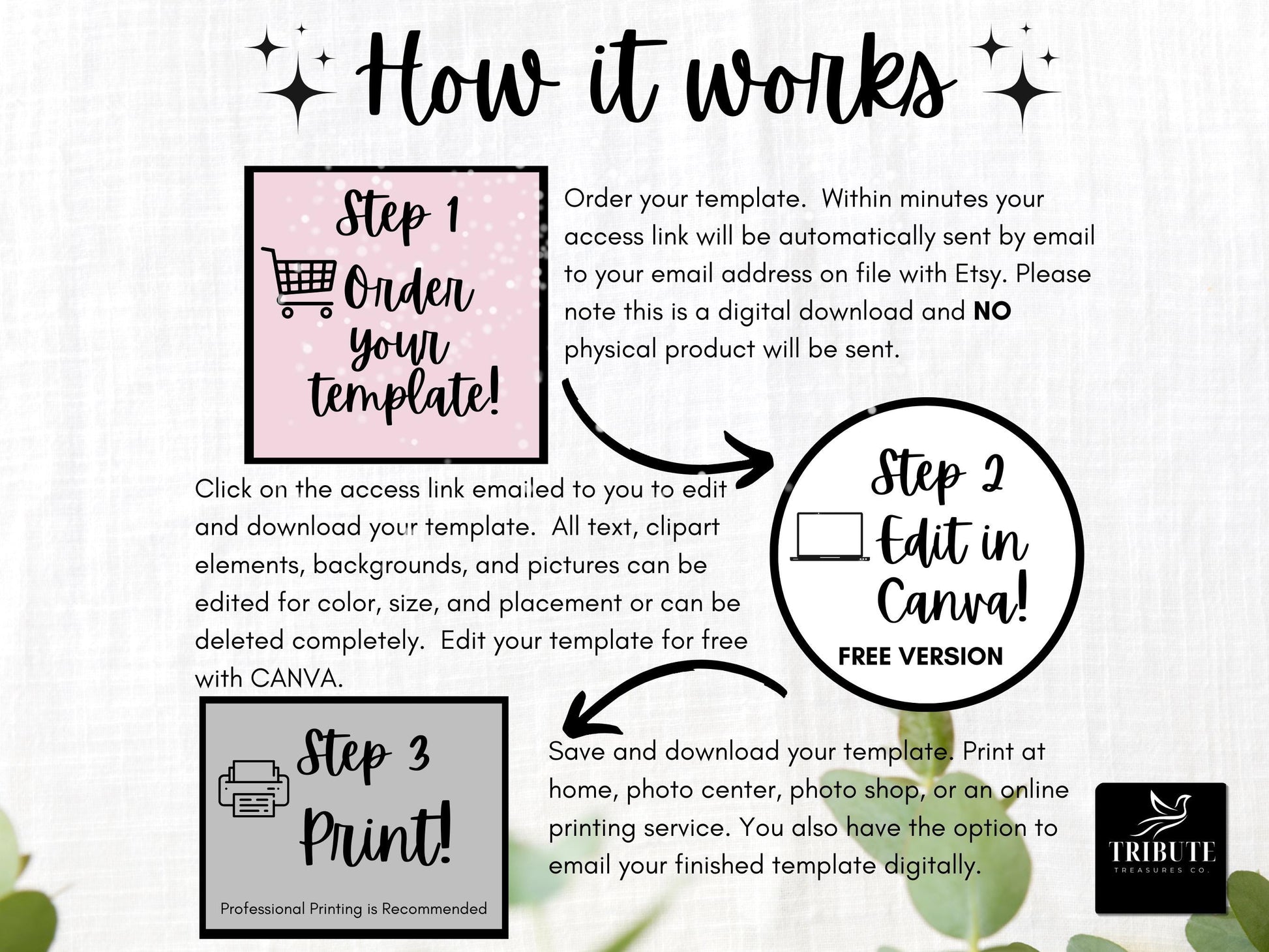 HOW IT WORKS: 1. After purchase, you will receive an email from Shopify to download your PDF file with the link to your editable Canva template. Or you can go to your purchases and downloads in your Shopify account. 2. Download your PDF and follow the link to your template(s) 3. Edit your template! 4. Download and use immediately!