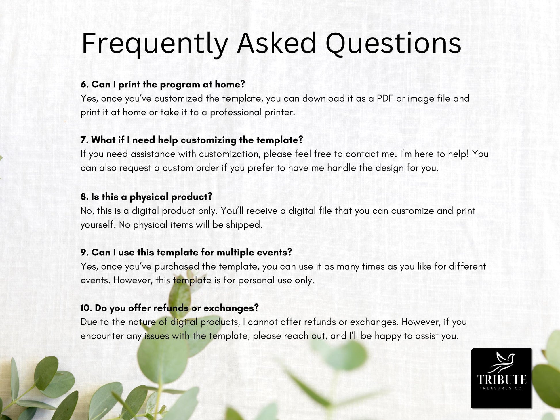 🔻Upgrade Options Available!🔻 • Upgrade Your Template: Expand your program to more pages! Options include upgrading from 4 to 8 pages, 4 to 12 pages, or 8 to 12 pages for an additional fee. • Change Program Size: Switch to 8.5x11 bi-fold, 11x17 bi-fold, or 11x17 tri-fold formats. • Custom Colors: Prefer a different color scheme? Customizations are available upon request!