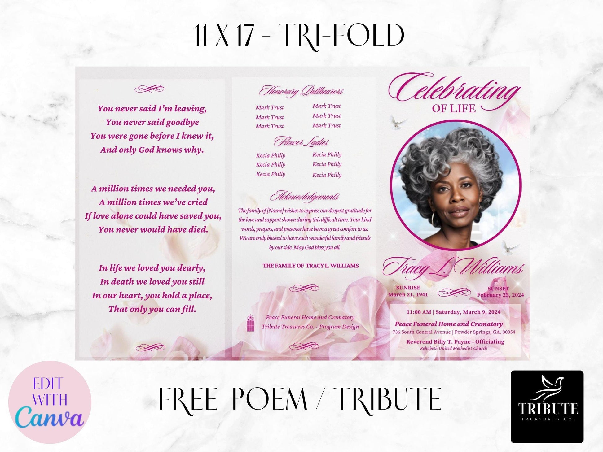 Editable Funeral, Obituary Program Template - Beautiful Pink Flowers Memorial Program - Personalized Order of Service | 11X17 Trifold